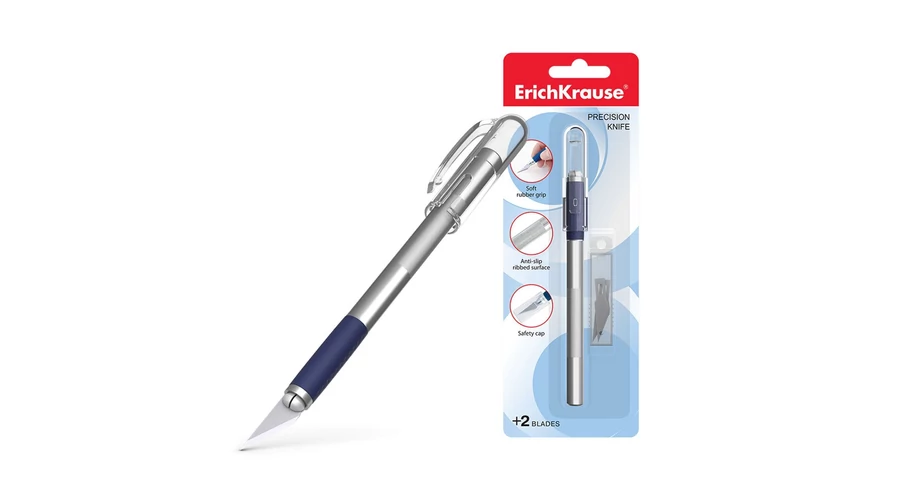 Precíziós kés (szike) a precíz papírvágáshoz. Teljesen fém test gumi markolattal és védőkupakkal. Kopásálló acélpengével, kétoldalas élezéssel. Korrózióálló. Két pótpengével a készletben.