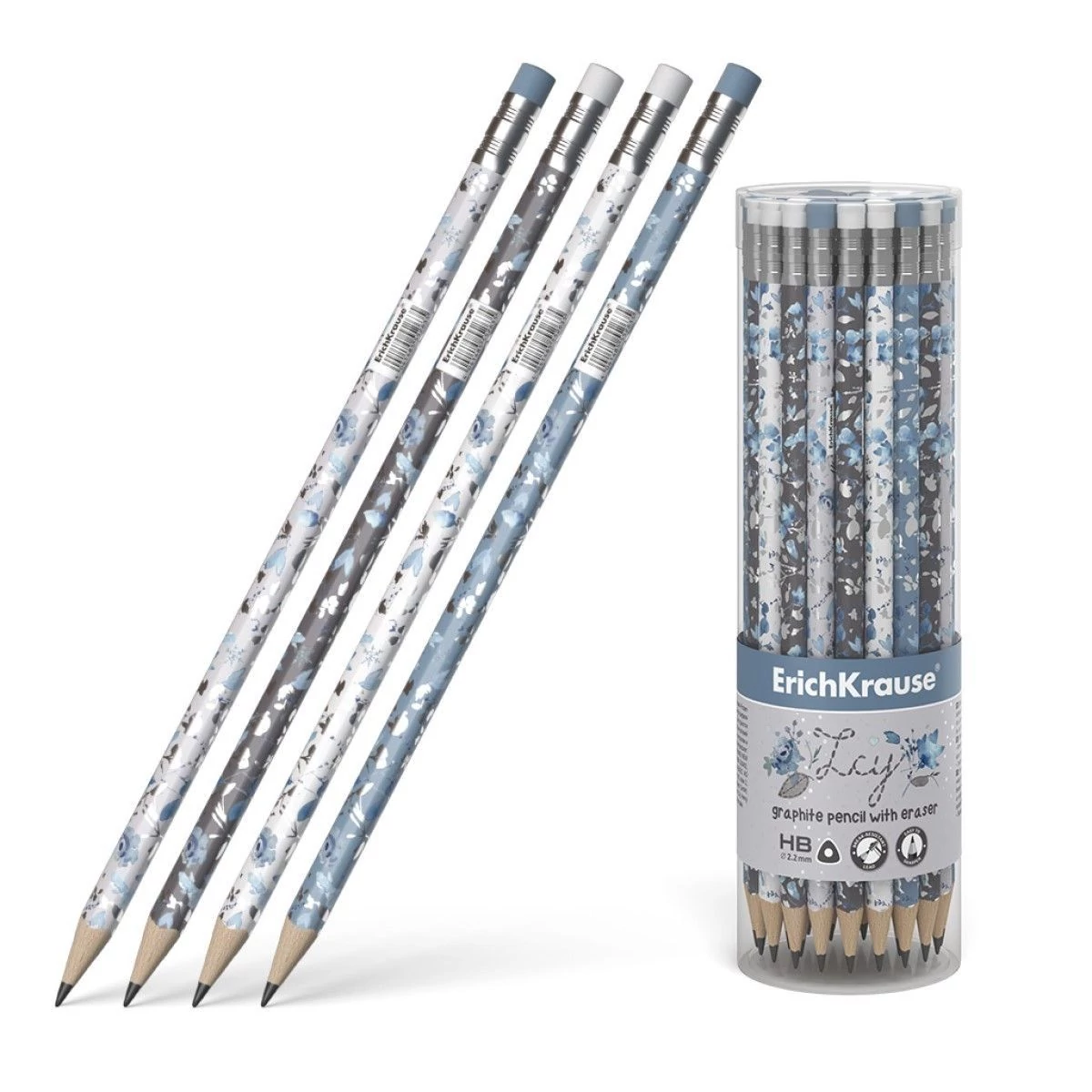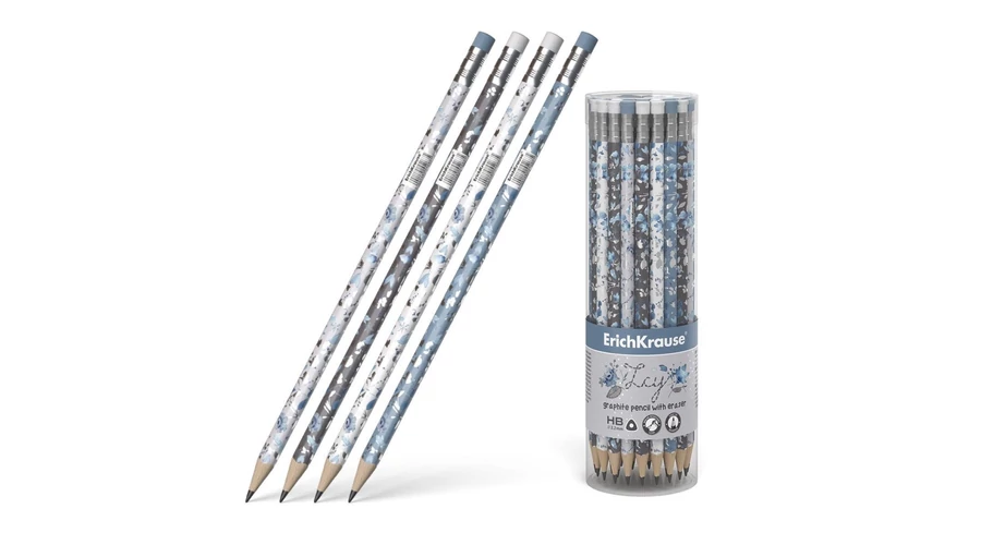 Háromszög alakú ceruza radírral, válogatott fából. Keménység: HB. Négy különböző testkialakítás, a radír színe megegyezik a ceruza testének színével. A fa speciális impregnálása és a bél erős kötése nagyfokú törésállóságot biztosít. Puha fa a ceruza könnyű hegyezéséhez. A 2,2 mm átmérőjű bél nem karcolja a papírt és nem morzsolódik. A közepesen kemény radír modern, környezetbarát és hipoallergén hőre lágyuló gumiból (TPR) készült, PVC-mentes. Ceruza hossza: 188 mm.