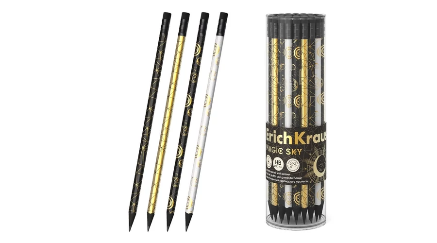 Háromszögletű grafitceruza válogatott fából készült radírral. Keménység: HB. Négy hengeres kialakítás fólia elemekkel, fekete fa, fekete radír. A speciális fa impregnálás és a tömör grafitragasztás nagy törésállóságot biztosít. A puha fa és a tökéletes grafitbeállítás könnyű hegyezést és gazdaságos ceruzahasználatot biztosít. A 2,2 mm átmérőjű grafit nem karcolja a papírt és nem morzsolódik. A közepes keménységű radír modern, környezetbarát és hipoallergén, PVC-mentes hőre lágyuló gumiból (TPR) készült. Ceruza hossza: 188 mm.