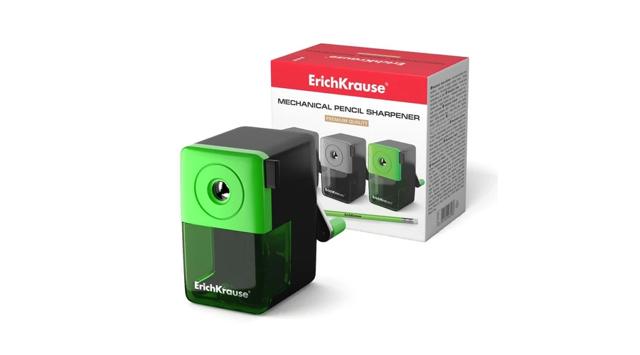 Mechanikus ceruzahegyező nagy, színezett tartállyal a forgács összegyűjtésére és rögzítő mechanizmussal az asztallaphoz való rögzítéshez. A hegyező 8 mm átmérőjű lyukkal rendelkezik a hagyományos grafit és színes ceruzák hegyezéséhez. A spirális alakú penge kiváló minőségű szénacél ötvözetből készült, és kiváló teljesítményt biztosít.