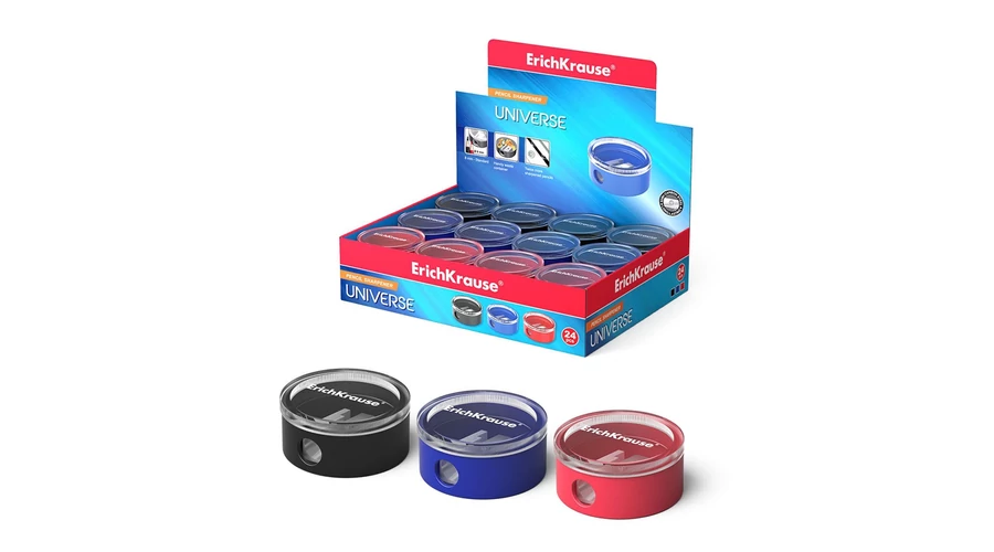 Műanyag hegyező tágas, színezett tartállyal a forgács gyűjtésére. A hegyező 8 mm átmérőjű lyukkal rendelkezik a hagyományos grafit és színes ceruzák hegyezéséhez.