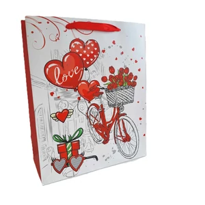 Papírtasak "Love" piros bicikli, tulipánnal és lufival L 26*32cm