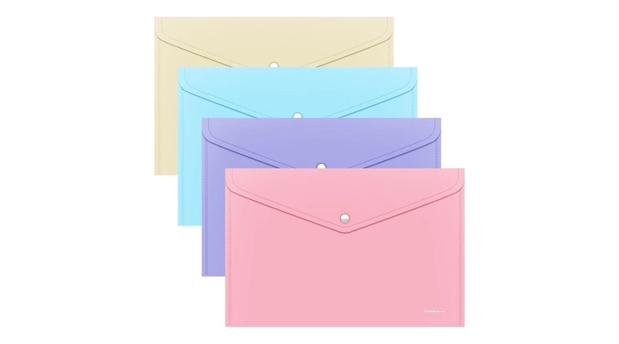 Az A4-es méretű borítékmappa kiváló minőségű, átlátszatlan műanyagból készült, "fényes" (tükör) felülettel. Dokumentumok tárolására tervezték. Különböző színek - lila, sárga, égkék, rózsaszín. Megbízható gombos záródás a dokumentumok gyors eléréséhez. Akár 120 papírlapot is képes tárolni. Méret - 232x333 mm, vastagság - 0,18 mm.