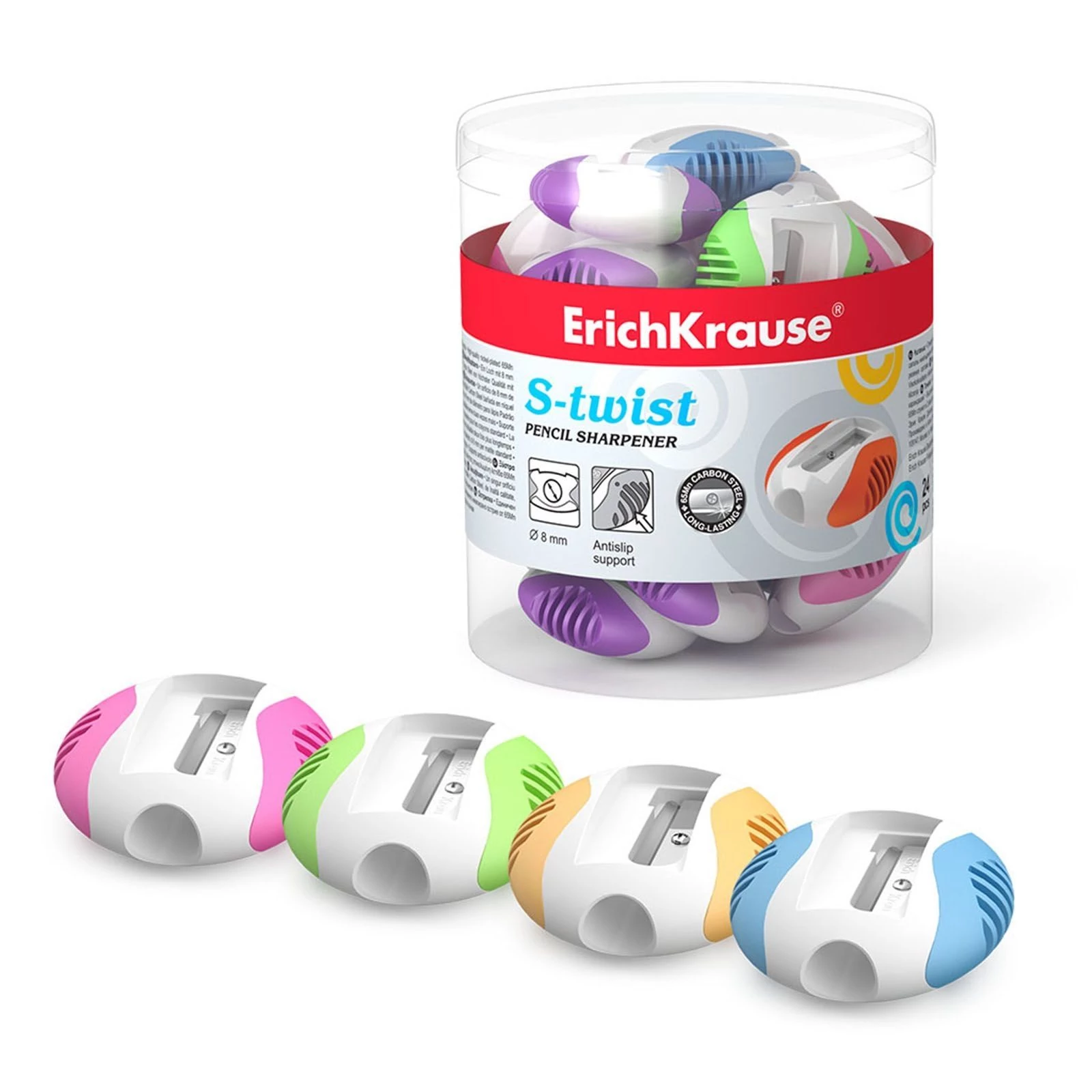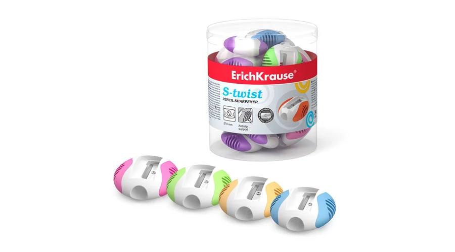 Műanyag hegyező tágas, színezett tartállyal a forgács gyűjtésére. A hegyező 8 mm átmérőjű lyukkal rendelkezik a hagyományos grafit és színes ceruzák hegyezéséhez.