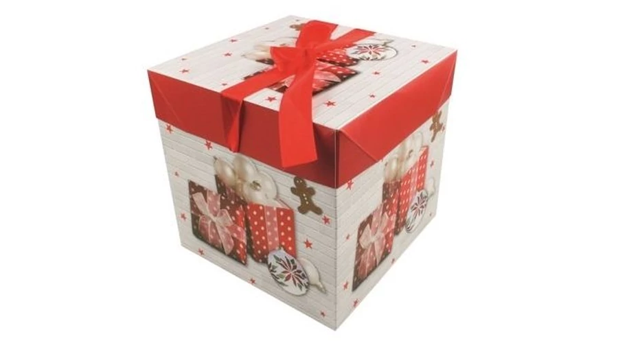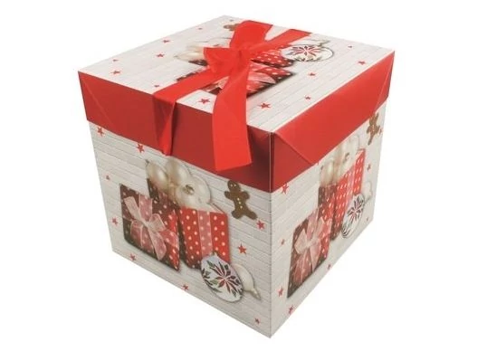Összecsukható ajándékdoboz masnival és karácsonyi motívumokkal.