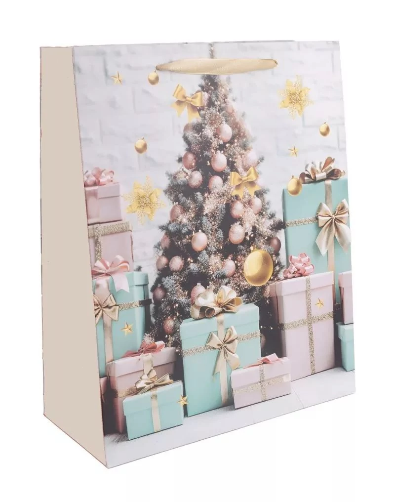 Karácsonyi papírtasak Fenyőfa türkiz, rózsaszín ajándékokkal M 18*23cm