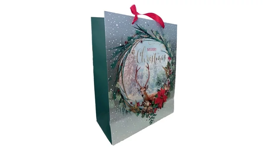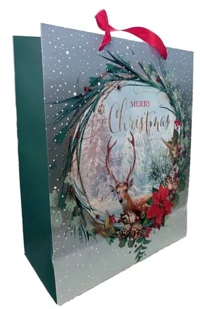 Karácsonyi papírtasak "Merry Christmas" Szarvas koszorúban M 18*23cm