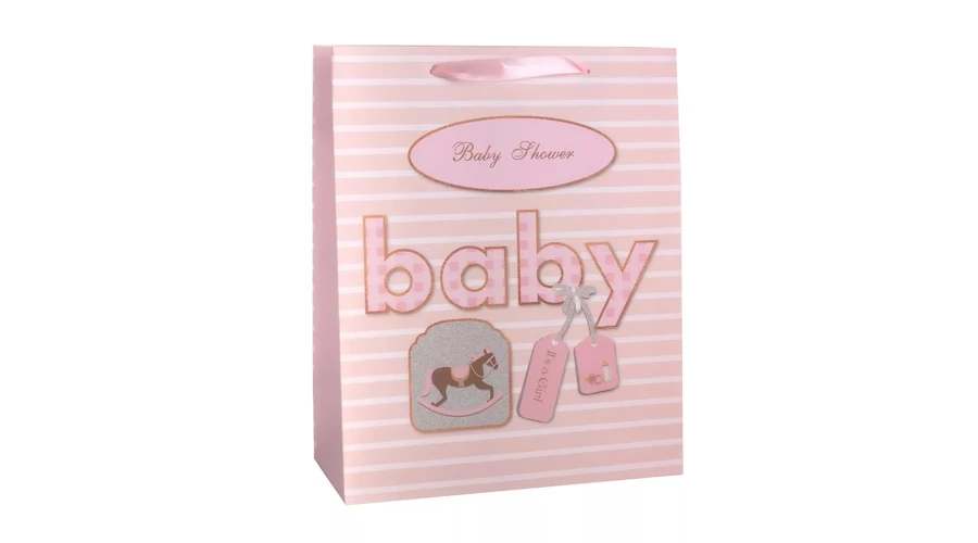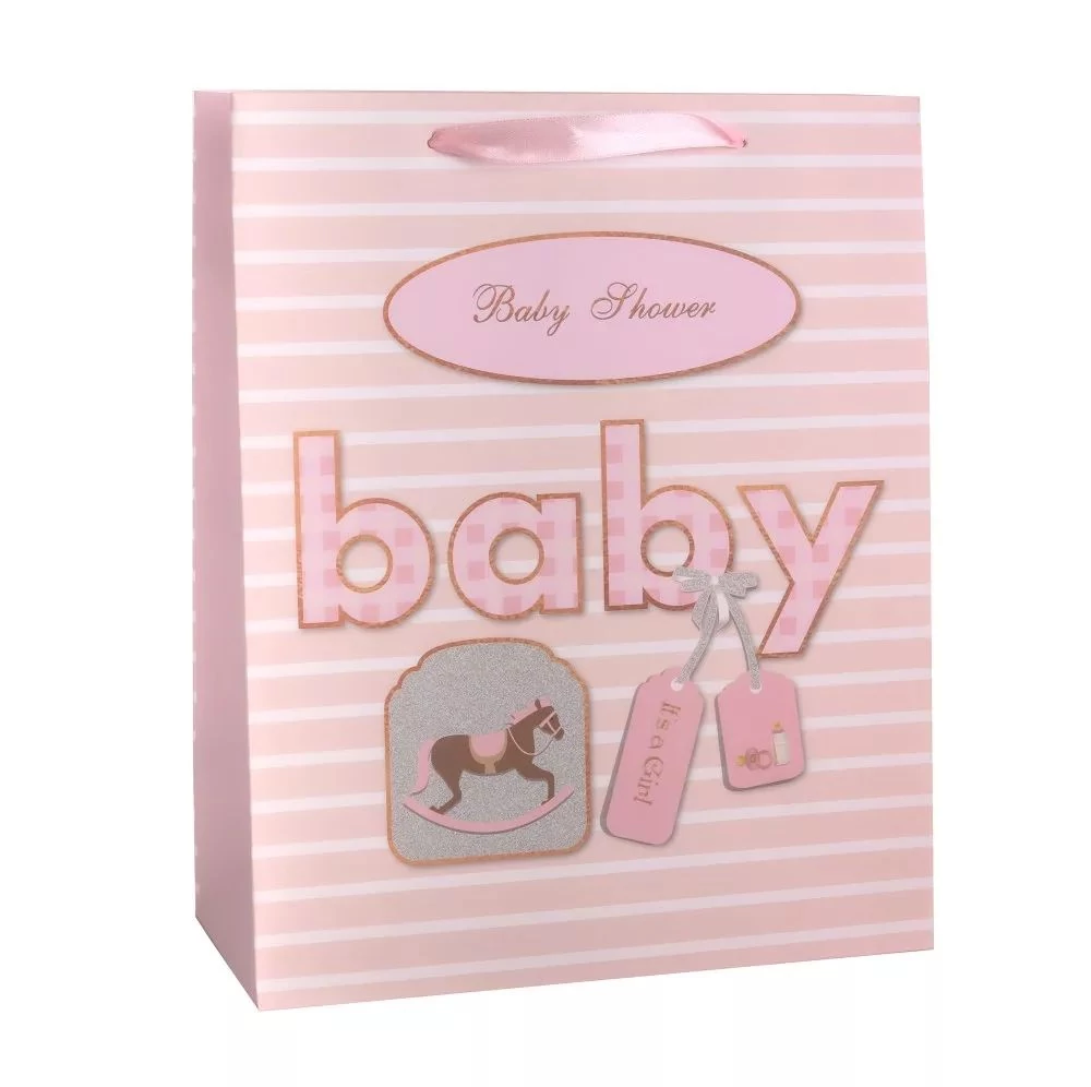 Papírtasak "It's a Girl" rózsaszín hintalovas L 26*32 cm