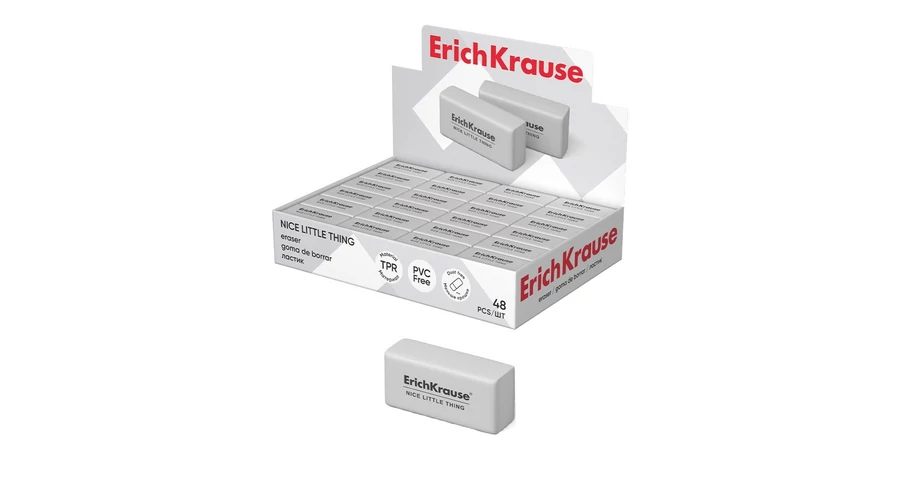 Klasszikus formájú puha radír modern, környezetbarát és hipoallergén hőre lágyuló gumiból (TPR). Pormentes. A radír kémiai összetétele nem tartalmaz PVC-t. Méret 32 x 15 x 12 mm.