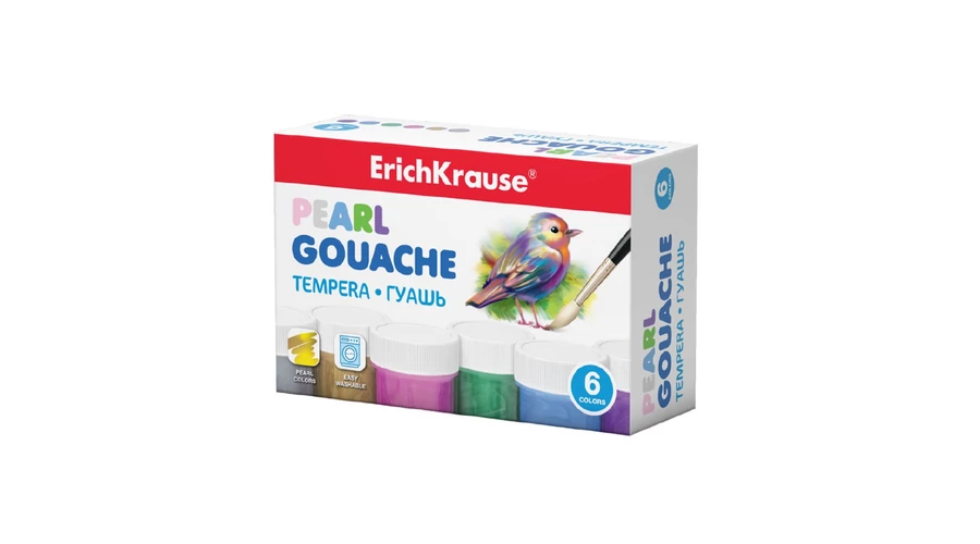 ErichKrause® gyöngyház gouache készlet 6 csillogó színnel. Gazdag, sűrű tónusokat kínál, kiváló fedőképességgel és matt-bársonyos felülettel. Vízbázisú, nem mérgező és könnyen lemosható.