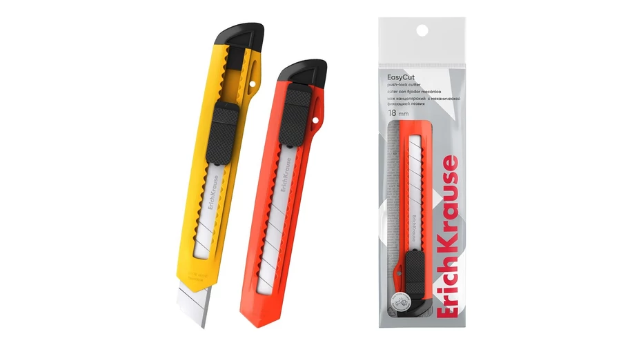 Barkácskés, nyomógombos, pengerögzítő rendszerrel és beépített törőszerkezettel. A kés teste könnyű és tartós műanyagból készült. Kopásálló acélpengével, kétoldalas élezéssel.