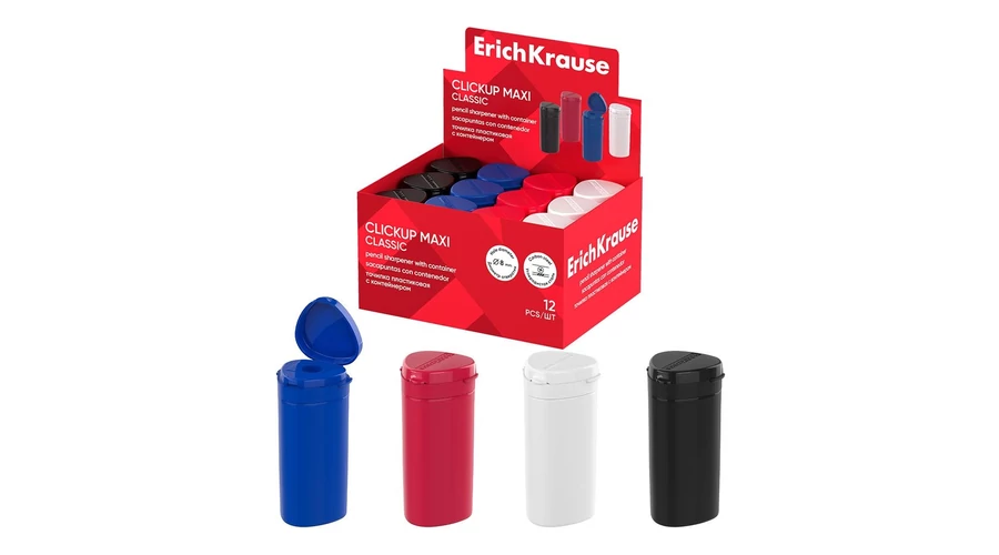 Műanyag hegyező tárolóedénnyel a forgácsok gyűjtésére. A tartály egy további fedéllel van ellátva, hogy megakadályozza a tartalom kiömlését. Lyuk a hagyományos grafit és színes ceruzák hegyezéséhez, 8 mm átmérőjű. Nikkelezett szénacél penge.