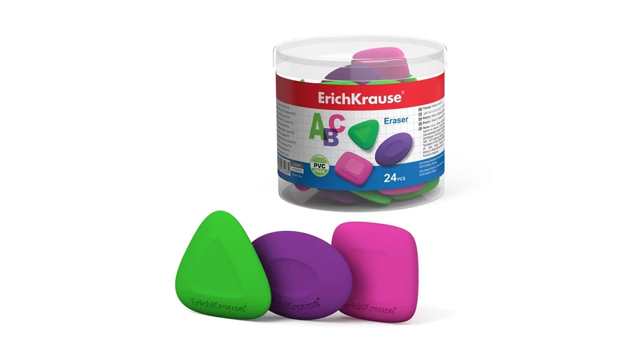 Klasszikus formájú radír modern, környezetbarát és hipoallergén hőre lágyuló gumiból (TPR). Pormentes. A radír kémiai összetétele nem tartalmaz PVC-t.
