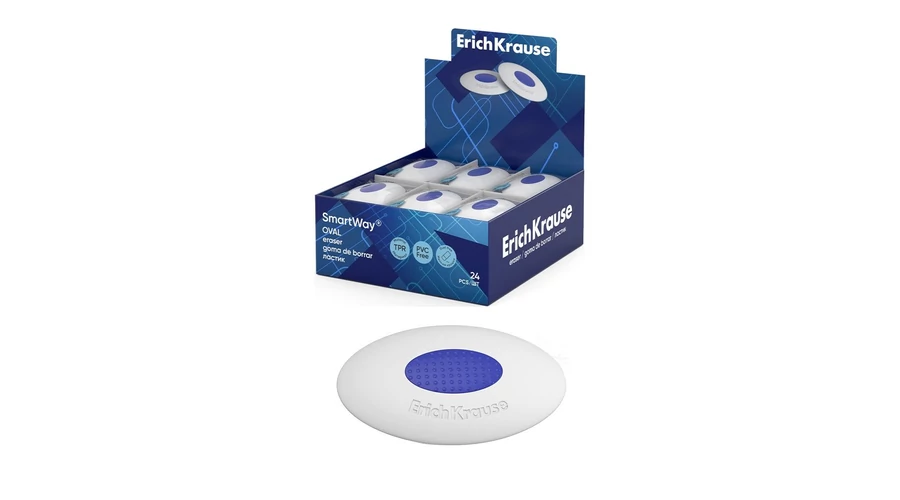 Közepes keménységű, klasszikus formájú radír modern, környezetbarát és hipoallergén hőre lágyuló gumiból (TPR). A test ergonomikus markolatú műanyag tartóval rendelkezik. Pormentes. A radír kémiai összetétele nem tartalmaz PVC-t. Méret 52 x 34 x 12 mm.